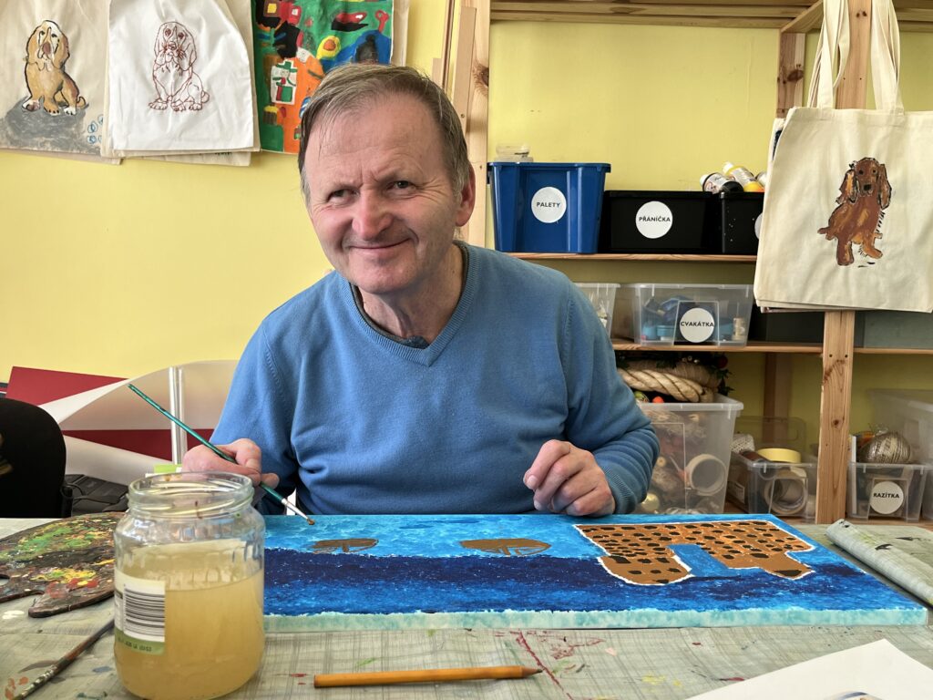 Pod jeho rukama kvetou květiny na zahradách, ale i na obrazech, které maluje ve Společnosti DUHA. Vítá mě úsměvem a slovy