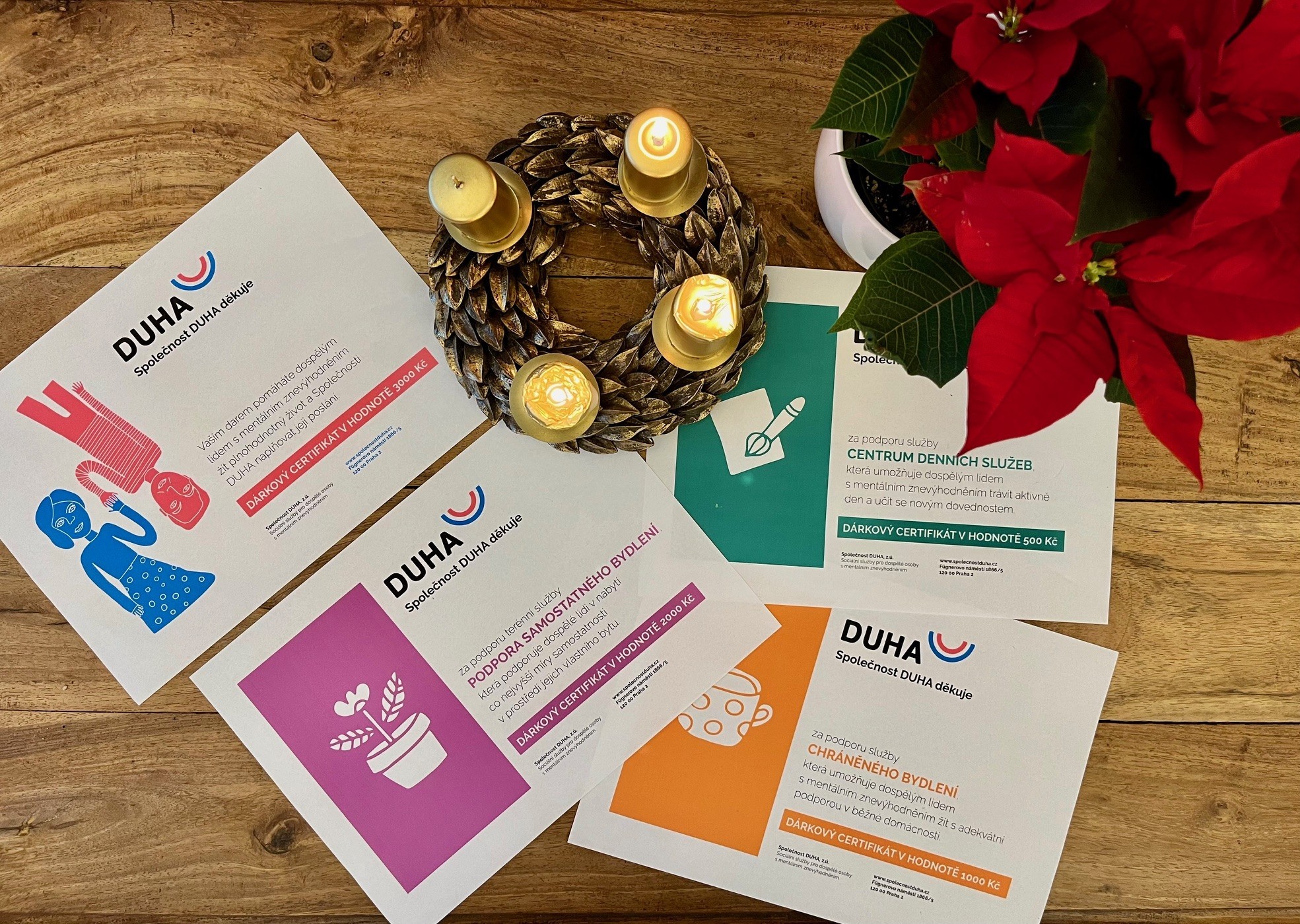 Obdarovat Společnost DUHA můžete nákupem dárkového certifikátu na charitativním e-shopu. Je to dárek na poslední chvíli, který vám rádi zašleme mailem. Na dárkový certifikát vyplníme vaše jméno nebo jméno vámi vybrané osoby. Objednávky na certifikát zaslaný mailem přijmeme až do půlnoci 22. prosince 2023 – podmínkou je platba online.