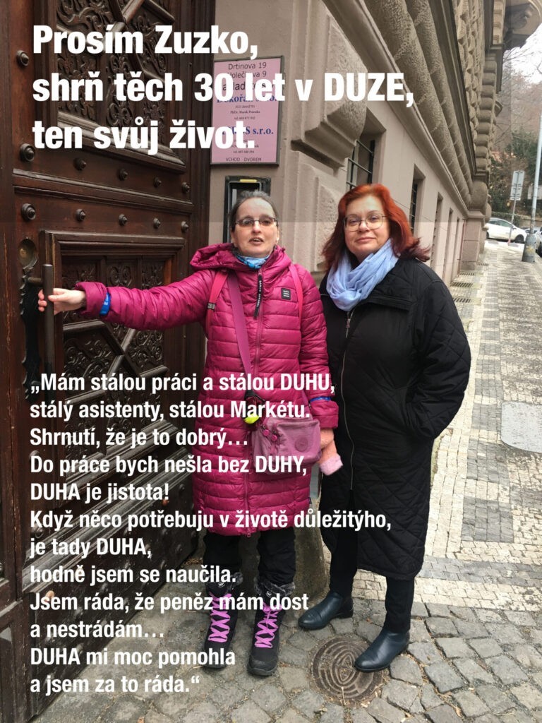 Zuzka je klientkou Společnosti DUHA již 30 let, od založení organizace. Využívala službu Chráněné bydlení, nyní využívá Podporu samostatného bydlení. Více se o jejím příběhu dočtete v publikaci „Eldorádo 30 let putování ke svobodnému životu“.