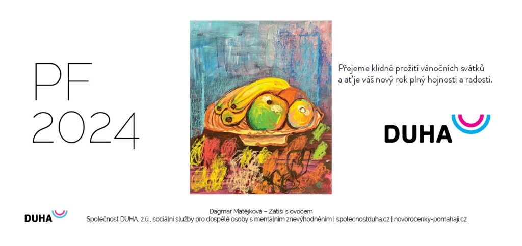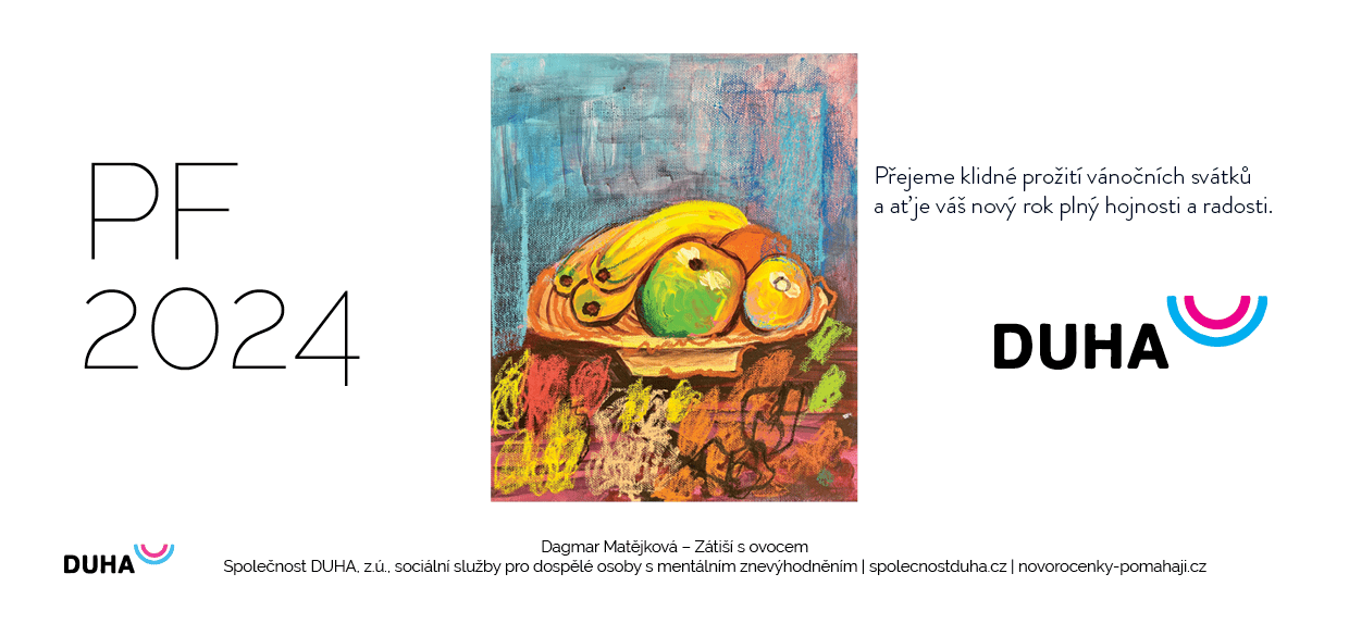 Vážení a milí přátelé Společnosti DUHA, za celou Společnost DUHA, její zaměstnance i klienty, vám přejeme jen to nejlepší, pevné zdraví, lásku i hodně času stráveného s těmi, které máte rádi. Děkujeme, že jste s námi a že pomáháte. Bez vás by to nešlo. Za krásný obraz Zátiší s ovocem na PF 2024 děkujeme paní Dagmar Matějkové, která se zapojila do našeho projektu Novoročenky pomáhají v roce 2023.
